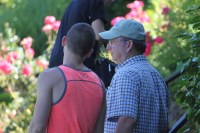 Mom, Shawn, and Princess at REI trying to get a picture of a guy with a funny suntan line on his head