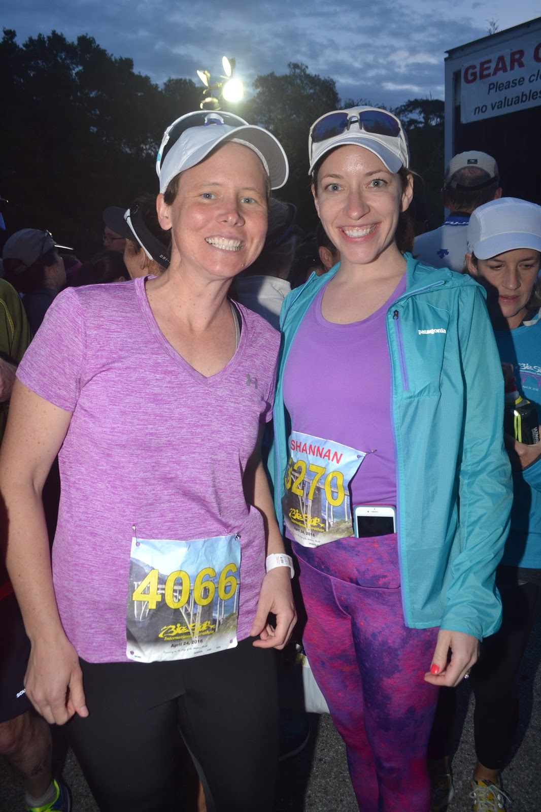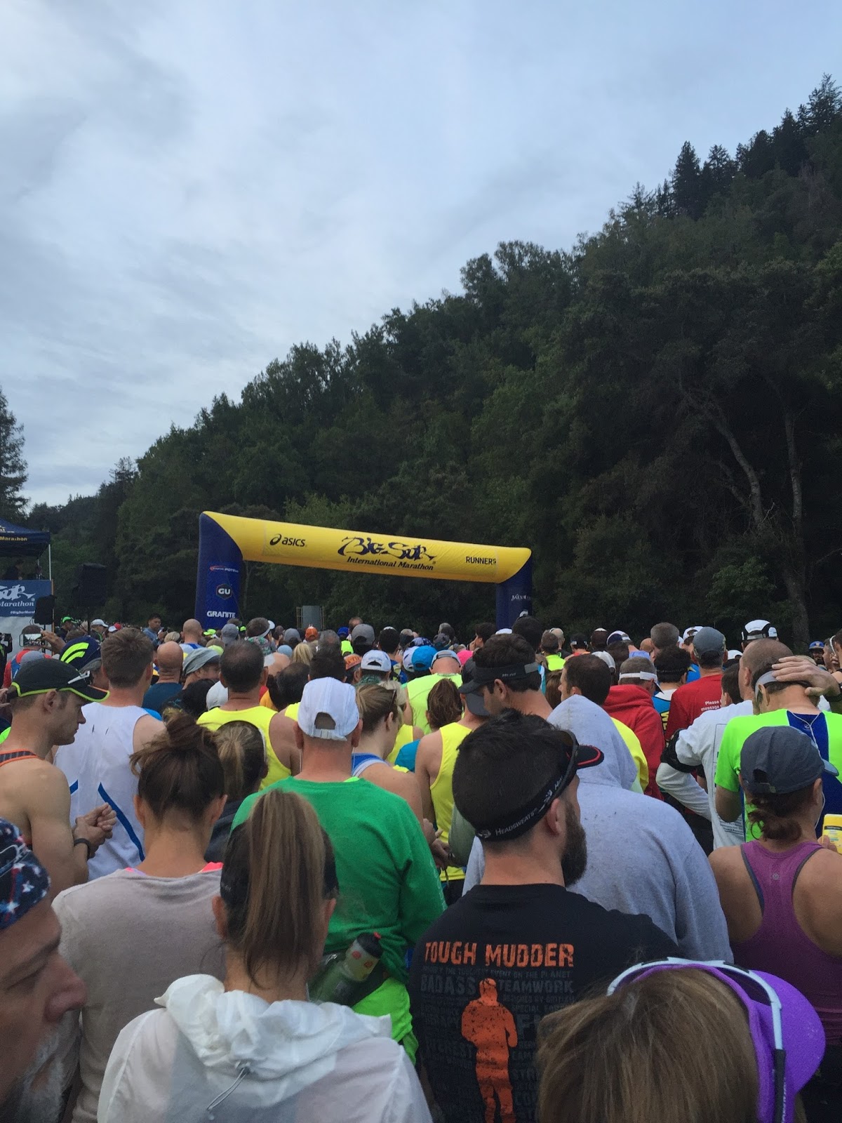 The night before, my cousin, her dad (they both flew in that afternoon), and I went to eat Italian and made sure to fuel properly. I had chicken Marsala sans mushrooms, whipped potatoes, caprese, and a little Pinot Noir. They decided to come pick me up in the morning around 3:15 a.m. (yes you read that correctly) to get to the buses which take you to the race start. Riding a bus in the cold and dark on a winding road wasn’t pleasant. And I got a little motion sick. Luckily, we had arrived TWO full hours before the race began so I had time to recover. I ate my two Quest bars, drank water and found some hot chocolate to warm up, ate some gels, then hunkered down under my trash bag I brought (weird, but good racing advice thanks to previous runners!). Before a race begins one must also go to the restroom several times (three for me).
