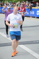 And then you know the end is near. There are fresh strawberries around mile 23, a group of people at the last hill telling you it’s the last hill, and many more spectators and racers from the other races on the course that day. Then you can see the flags near the end and then the end. I started to “sprint” as much as a person could at that point to the finish. I saw the clock time read 4:00:58. Since I started the race a little after the gun I knew I’d made my goal for sure. I raised my hands in joy and exhaustion and then burst into tears. I’d done it! A volunteer put a medal around my neck and a gal near me asked if I was okay. I said, “I did it! I did it in 4 hours!” She told me she knew and asked if I needed a hug. I couldn’t speak at that point, but nodded with a yes.